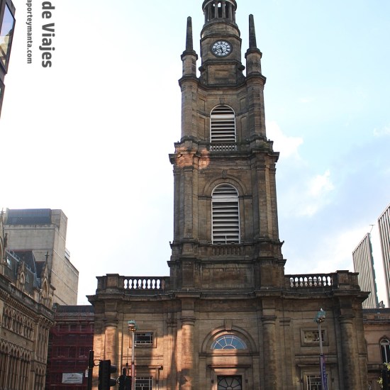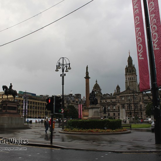 Caminando por la calle Buchanan, al final de la misma se vislumbraba la silueta de una iglesia, esa es la iglesia de St. Geroge del siglo XIX, tomando calle St George Street, la siguiente parada era la plaza de St. George, una plaza enorme que es otro de los grandes puntos neurálgicos de la ciudad, donde se encuentran grandes edificios de oficinas y también varios monumentos como por ejemplo The Cenotaph que es un monumento en memoria de los ciudadanos de Glasgow fuero abatidos en la Segunda Guerra Mundial, en el centro de la plaza está una gigante estatua del conocido Sir Walter Scott, y mirando al este, podemos encontrar el gran edificio del City Chambers, el Ayuntamiento de la ciudad de Glasgow.