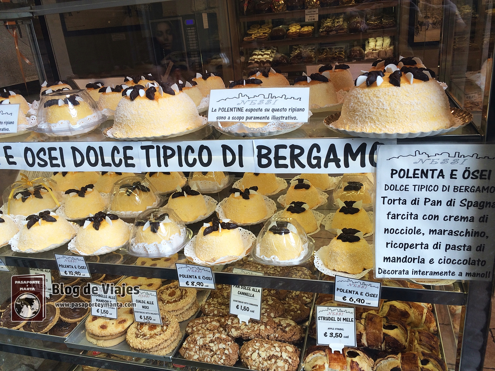 Tomamos un café en la cafetería Nessi donde pudimos disfrutar de un dulce típico de la ciudad, Polenta e Osèi, son unas capas de bizcocho rellena de chocolate y almendra recubierto con una masa de mazapán amarillo por encima, deliciosa.