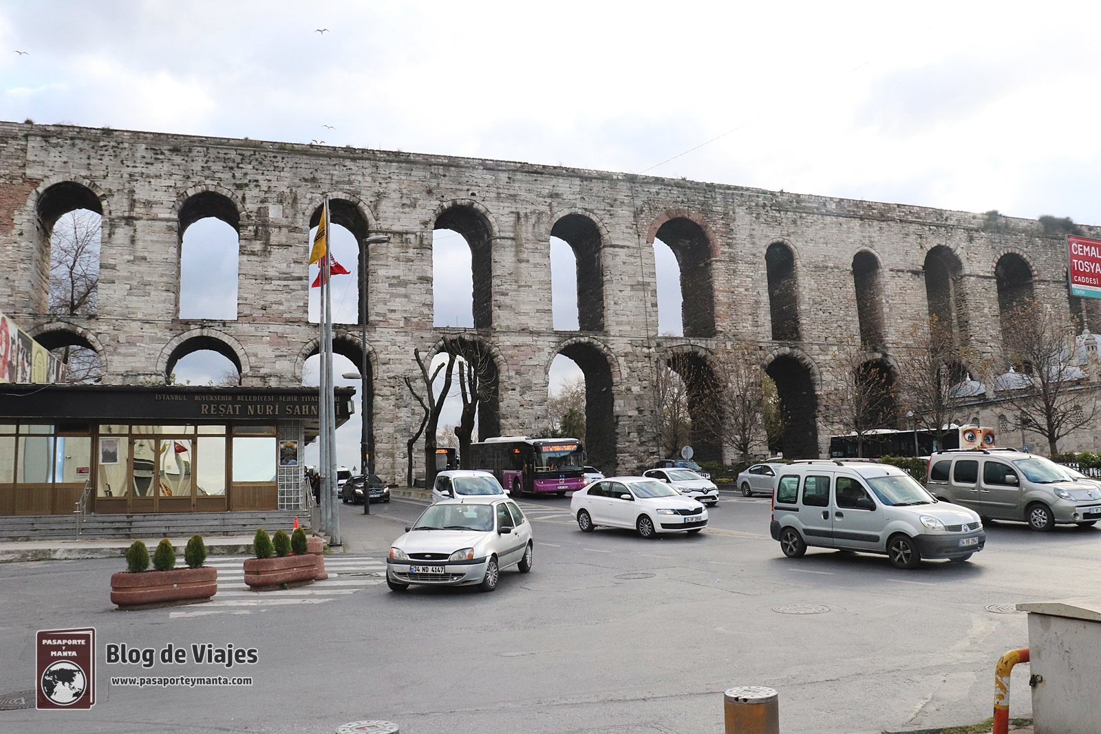 - De camino hacia nuestro paseo en ferry por el Bósforo, pasamos al lado del Valens Aqueduct (Bozdoğan Kemeri), el Acueducto de Valente, a la mente se vino la ciudad española de Segovia por su enorme parecido con este gran acueducto romano, situado en la parte europea de Estambul; su construcción finalizó bajo el reinado del emperador romano Valente en el año 368 Tiene 64 m de altura desde el nivel del mar y 20 m desde su base. En su origen tenía 1 km de longitud pero actualmente solo se conservan 600 m en el barrio de Unkapani y 200 m en Beyazıt.