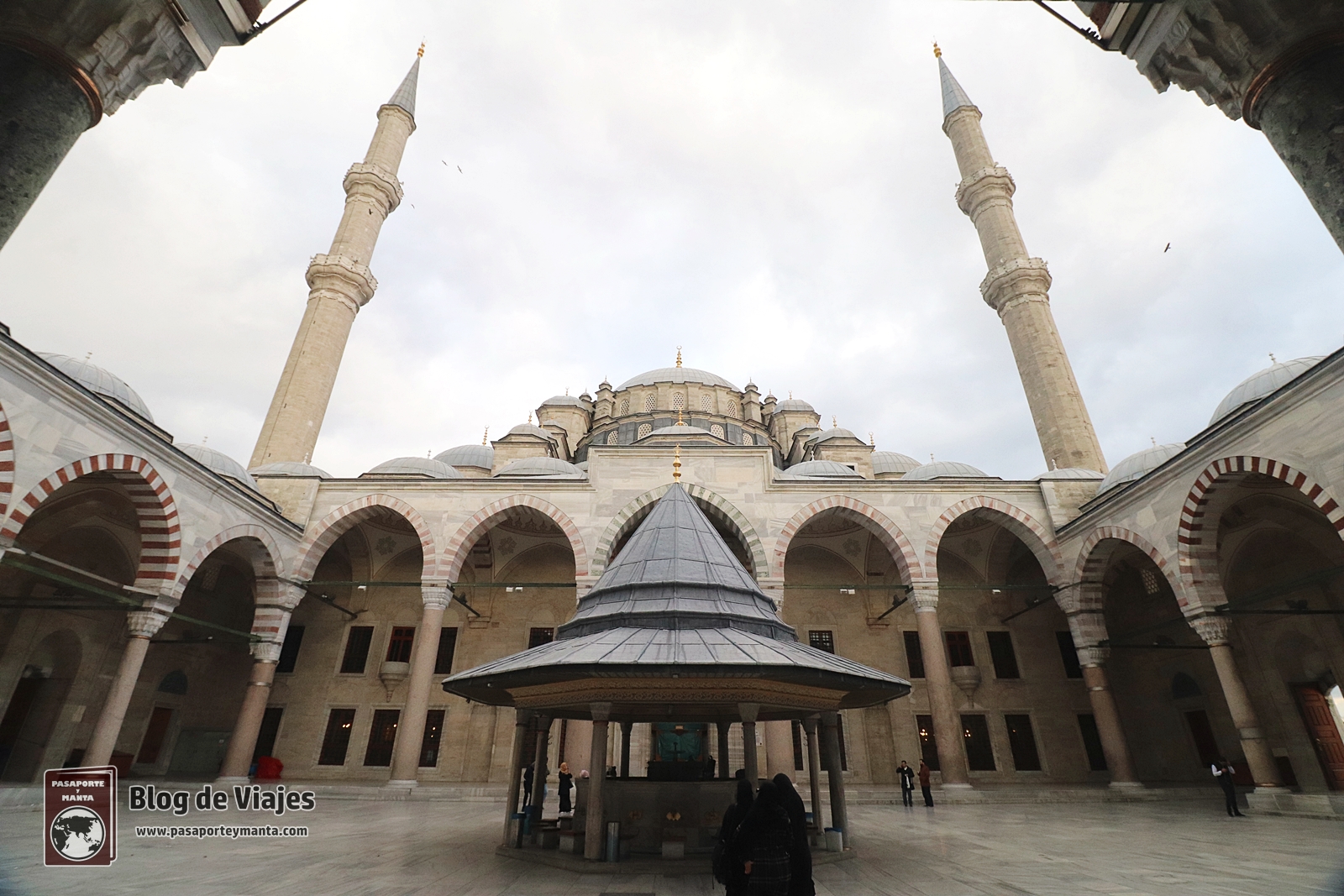 - Tras salir de allí pusimos rumbo a una de las mezquitas más importantes de la parte europea de la ciudad, Suleyman Mosque (Süleymaniye Camii) en castellano mezquita de de Solimán o mezquita de Süleymaniye, fue mandada a construir por el Sultán Solimán I (El Magnifico) y terminada en 1558. A diferencias de otras que habíamos visto esta tiene un patio interior que lo rodean los 4 minaretes altísimos.